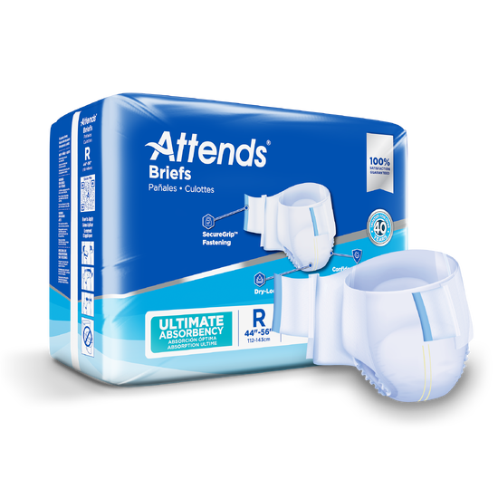 Attends Advanced Briefs provides maximum protection for users suffering from heavy to severe incontinence. This high-performance brief combines all the benefits of the Attends Brief but goes a step further in absorbency and protection. Designed to keep you protected with SmartCool™ Breathable Material for 100% breathability, ConfidenceCuff™ Protection to help prevent leaks around the legs, and a Dry-Lock® Containment Core to help you stay dry throughout the day or night. Attends Advanced Briefs is constructed with cloth-like material for premium softness comfort, and offers odor control.