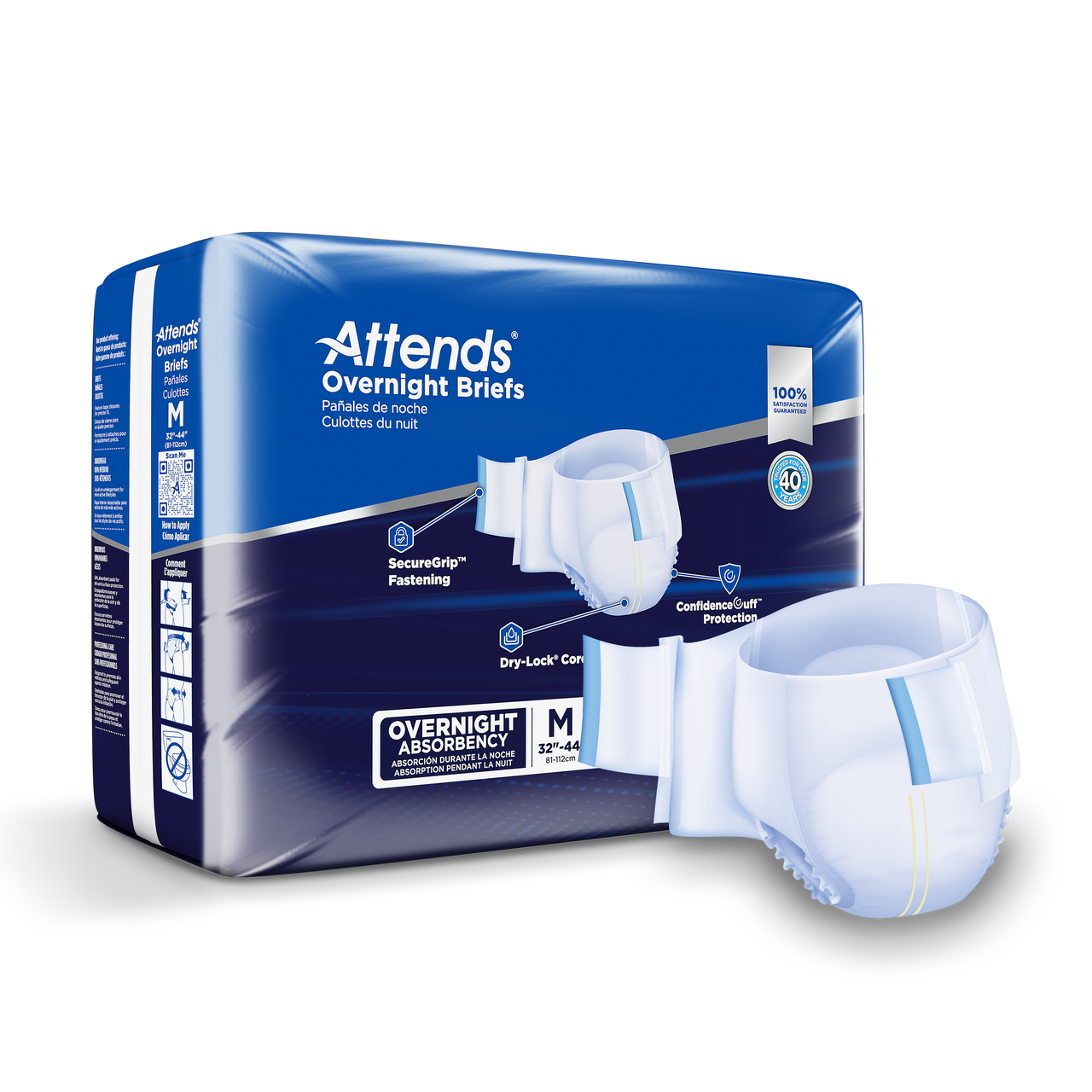 Attends Overnight Briefs with extended wear protection were developed for users and caregivers looking for a product that can be used for extended periods of time, either day or night. The Dry-Lock® Containment core helps promote dryness throughout the day or night, which allows users to stay dry, confident and comfortable between changes. ConfidenceCuff™ Protection helps prevent leaks around the legs to increase security for users and caregivers needing to contain both urinary and fecal incontinence. SmartCool™ Breathable Materials provide 100% breathability to help improve comfort and help promote skin wellness.