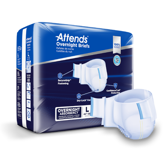 Attends Overnight Briefs with extended wear protection were developed for users and caregivers looking for a product that can be used for extended periods of time, either day or night. The Dry-Lock® Containment core helps promote dryness throughout the day or night, which allows users to stay dry, confident and comfortable between changes. ConfidenceCuff™ Protection helps prevent leaks around the legs to increase security for users and caregivers needing to contain both urinary and fecal incontinence. SmartCool™ Breathable Materials provide 100% breathability to help improve comfort and help promote skin wellness.