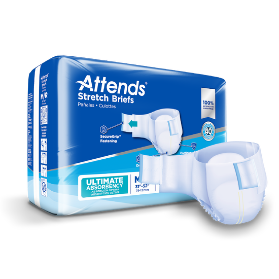 The Attends Stretch Briefs provides maximum protection for heavy to severe incontinence, with stretchable side panels for a contoured and secure fit. This brief is constructed with stretchable Breathable Side Panels for a comforable fit, ConfidenceCuff™ Protection to help prevent leaks around the legs, and a Dry-Lock® Containment Core to help you stay dry throughout the day or night. Attends Stretch Briefs is constructed with cloth-like material for premium softness comfort, and offers odor control.