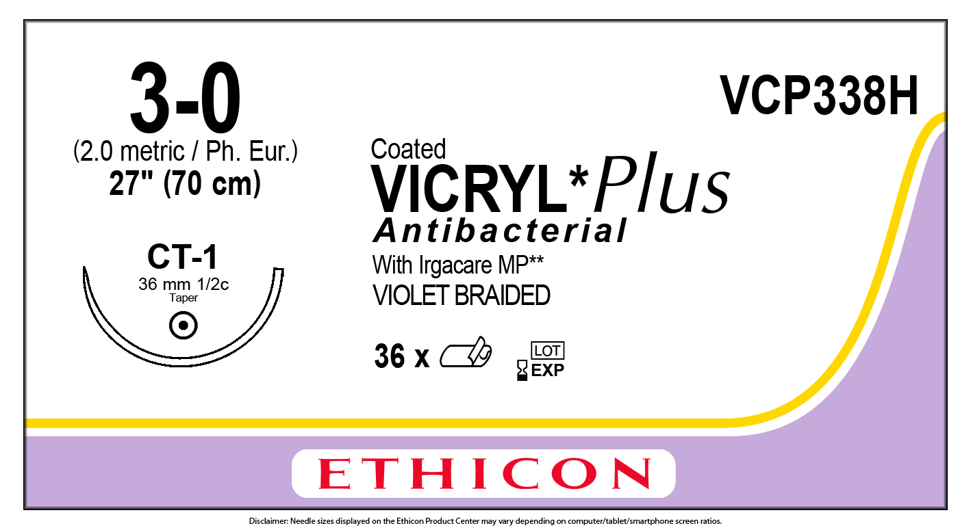 J&J Ethicon COATED VICRYL® Plus Antibacterial (polyglactin 910) Suture 36 each/box VCP338H 3-0 COATED VICRYL PLUS VIOLET 1X27" CT-1 Brand:... Read more